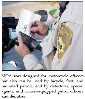 The Mobile Officer's Assistant was developed by Anacapa Sciences, Inc., and Toomay Technologies under contract to the U.S. Department of Transportation's National Highway Traffic Safety Administration (NHTSA). MOA has been designed to increase the safety and effectiveness of law enforcement officers through the application of advanced technology, guided by human factors design principles. MOA also deliv-ers the many cost-saving advantages of automation.